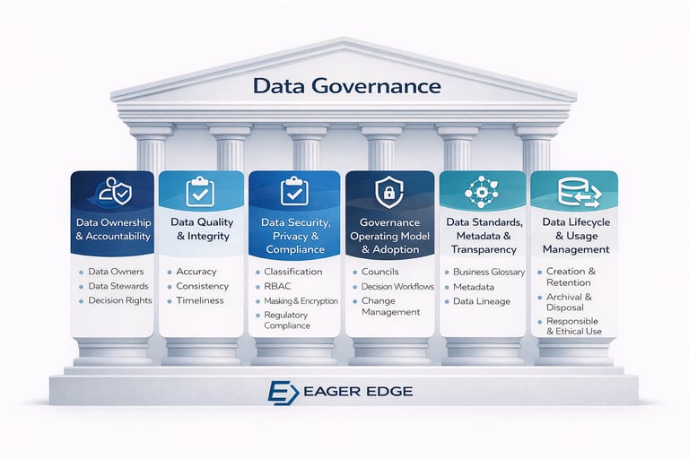This pillar establishes clear data ownership, stewardship, and decision rights. By defining who owns data and who is accountable for its quality, definitions, and access, organizations eliminate ambiguity and enable faster, more consistent decisions.